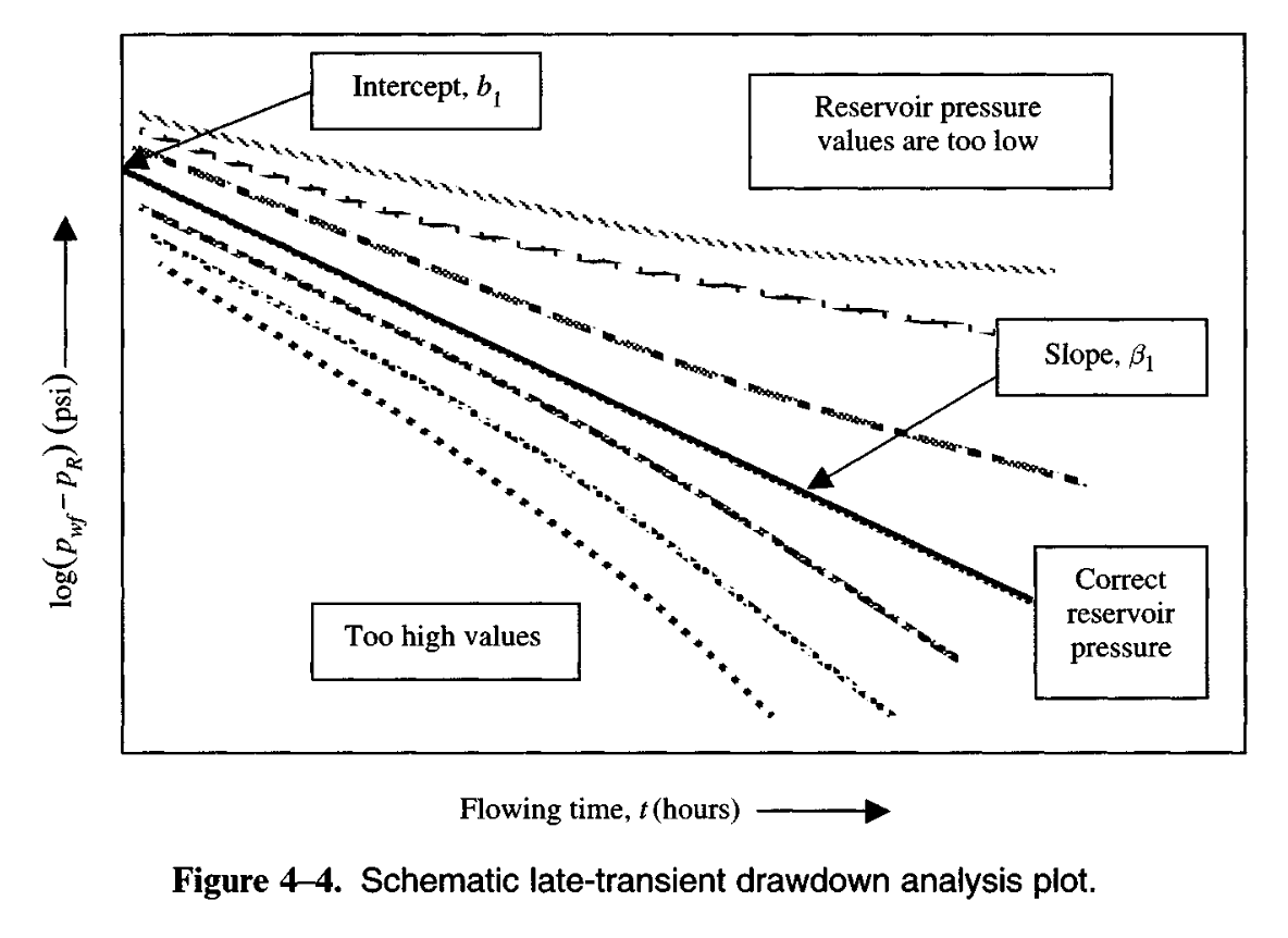 the plot of versus will be linear provided the value of is known. usually it is not. this means that trial and error plot must be made using assumed values. That value which yields the best straight line on the versus t is chosen as the correct value. A schematic late transient drawdown analysis plot is shown in the Figure.